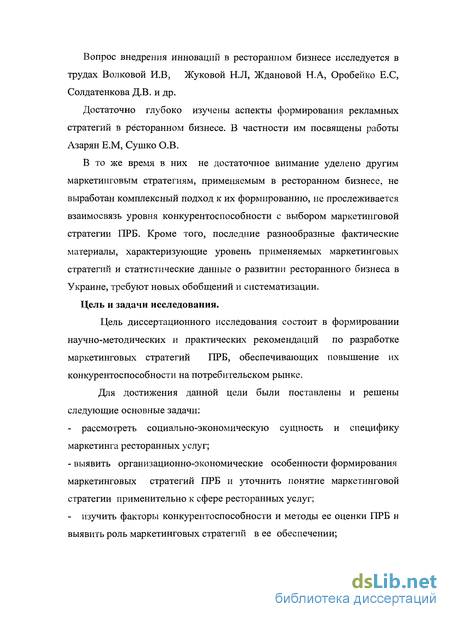 В то же время в них не достаточное внимание уделено другим маркетинговым стратегиям, применяемым в ресторанном бизнесе, не выработан комплексный подход к их формированию, не прослеживается взаимосвязь уровня конкурентоспособности с выбором маркетинговой стратегии ПРБ. Кроме того, последние разнообразные фактические материалы, характеризующие уровень применяемых маркетинговых стратегий и статистические данные о развитии ресторанного бизнеса в Украине, требуют новых обобщений и систематизации.