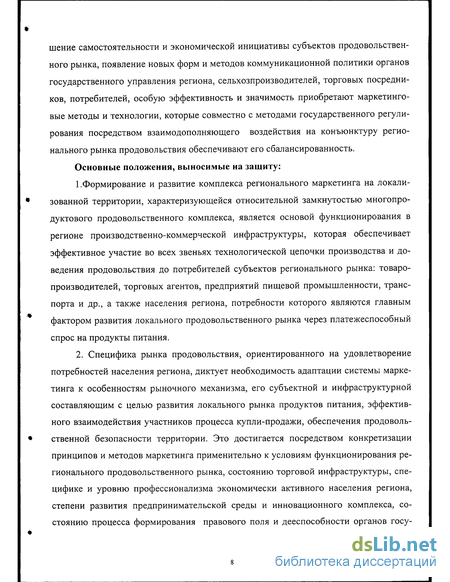 Рабочая гипотеза диссертационного исследования состоит в признании действенного регулирующего воздействия системы регионального маркетинга на конъюнктуру локального продовольственного рынка. Воздействие органов государственного управления на механизм регионального рынка продовольствия пока не обеспечивает стабилизации его деятельности, сбалансированности спроса и предложения, эффективного удовлетворения потребностей населения в продовольствии. В связи с тем, что следствием рыночных реформ стали такие процессы, как: формирование многообразия форм собственности в продовольственном комплексе, повы шение самостоятельности и экономической инициативы субъектов продовольственного рынка, появление новых форм и методов коммуникационной политики органов государственного управления региона, сельхозпроизводителей, торговых посредников, потребителей, особую эффективность и значимость приобретают маркетинговые методы и технологии, которые совместно с методами государственного регулирования посредством взаимодополняющего воздействия на конъюнктуру регионального рынка продовольствия обеспечивают его сбалансированность.