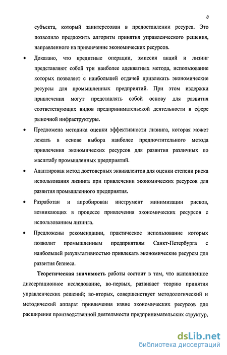 Теоретическая значимость работы состоит в том, что выполненное диссертационное исследование, во-первых, развивает теорию принятия управленческих решений; во-вторых, совершенствует методологический и методический аппарат привлечения извне экономических ресурсов для расширения производственной деятельности предпринимательских структур,