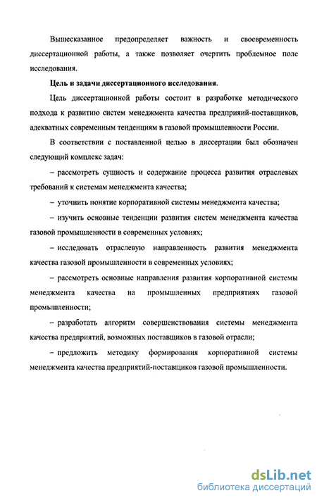 Цель диссертационной работы состоит в разработке методического подхода к развитию систем менеджмента качества предприяий-поставпщков, адекватных современным тенденциям в газовой промышленности России,