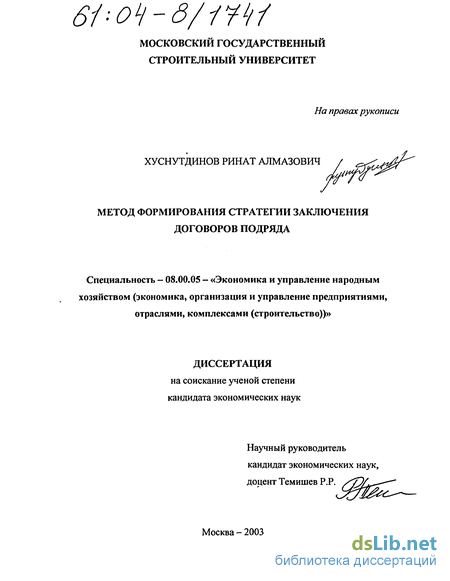 Апробация и реализация результатов исследования. Основные положения и выводы диссертационной работы докладывались на конференциях молодых ученых в МГСУ и семинарах кафедры «Экономика и управление в строительстве» МГСУ. Предложенная в работе методика используется при стратегическом планировании заключения договоров на подрядном предприятии ООО «Полистройсервис».