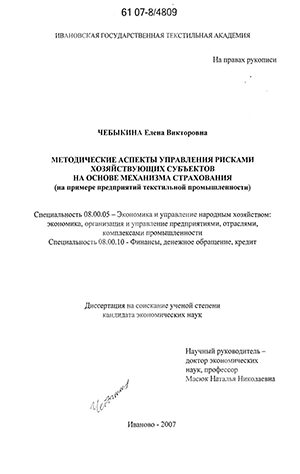 Цель работы – разработка методических аспектов управления рисками хозяйствующих субъектов на основе механизма их страхования (на примере текстильных предприятий).