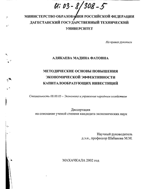 В третьей главе «Методические подходы к повышению экономической эффективности использования инвестиций» дается математическое и экономическое обоснование возможности повышения экономической эффективности капитальных вложений при правильном планировании поэтапного ввода объекта в действие, разработан алгоритм оценки экономической эффективности инвестиционного проекта с момента возникновения идеи о нем до начала его эксплуатации. Приводятся результаты апробации разработанной методики на примере инвестиционных проектов, осуществленных в РД в 2000 году.
