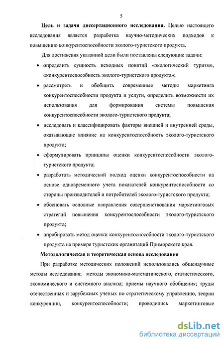 Несмотря на решение многих теоретических проблем конкурентоспособности различных социально-экономических систем в отечественной экономической науке, пока недостаточно разработаны методические основы повышения конкурентоспособности эколого-туристского продукта, что определили выбор темы, объекта, предмета, цели и задач диссертационного исследования