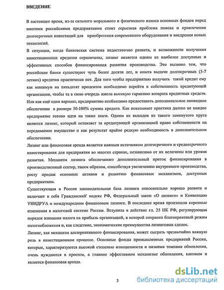 Существующая в России законодательная база лизинга относительно хорошо развита и включает в себя Гражданский кодекс РФ, Федеральный закон «О лизинге» и Конвенцию УНИДРУА о международном финансовом лизинге. В последнее время произошли коренные изменения в налоговой системе России. Вступила в действие гл. 25 НК РФ, регулирующая порядок взимания налога на прибыль организаций, в которой сохранен благоприятный режим налогообложения и, как следствие, экономические преимущества лизинговых сделок. Лизинг, как механизм альтернативного финансирования, может сыграть чрезвычайно важную роль в инвестиционном процессе. Основные фонды промышленных предприятий России, которые, характеризуются высокой степенью изношенности и низкими темпами обновления, очень нуждаются в простом, а главное эффективном механизме обновления, каковым и является финансовая аренда.