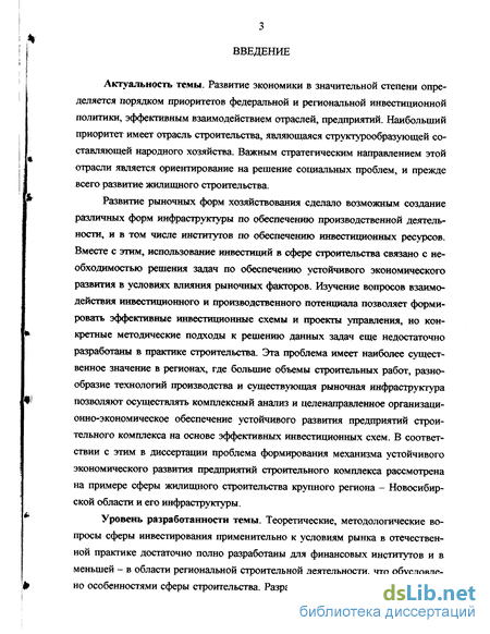 Развитие рыночных форм хозяйствования сделало возможным создание различных форм инфраструктуры по обеспечению производственной деятельности, и в том числе институтов по обеспечению инвестиционных ресурсов. Вместе с этим, использование инвестиций в сфере строительства связано с необходимостью решения задач по обеспечению устойчивого экономического развития в условиях влияния рыночных факторов. Изучение вопросов взаимодействия инвестиционного и производственного потенциала позволяет формировать эффективные инвестиционные схемы и проекты управления, но конкретные методические подходы к решению данных задач еще недостаточно разработаны в практике строительства. Эта проблема имеет наиболее существенное значение в регионах, где большие объемы строительных работ, разнообразие технологий производства и существующая рыночная инфраструктура позволяют осуществлять комплексный анализ и целенаправленное организационно-экономическое обеспечение устойчивого развития предприятий строительного комплекса на основе эффективных инвестиционных схем. В соответствии с этим в диссертации проблема формирования механизма устойчивого экономического развития предприятий строительного комплекса рассмотрена на примере сферы жилищного строительства крупного региона - Новосибирской области и его инфраструктуры.