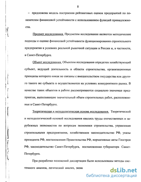 Предмет исследования. Предметом исследования являются методические подходы к оценке финансовой устойчивости функционирования строительного предприятия в условиях реальной рыночной ситуации в России и, в частности, в Санкт-Петербурге.