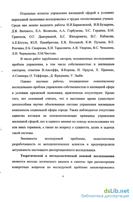 В числе работ зарубежных авторов, посвященных исследованию проблем управления, в том числе собственностью и жилищным сектором, отметим И.Ансоффа, Я.Корнаи, Н. Ордуэя, X. Приемас, А.Соммера, О. Тоффлера., Д. Фридмана, У. Эшби.