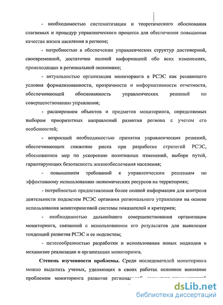 Использование мониторинга в РСЭС позволяет оценивать: уровень развития или стагнации как региона в целом, так и отдельных его подсистем; действенность помощи по вертикали; соответствие индикаторов и показателей региональной экономики предельным уровням. Однако отсутствие общепринятой методологии мониторинга и механизма его организации в РСЭС и ее подсистемах препятствует эффективному его использованию. Таким образом, актуальность диссертационного исследования, проблем методологии мониторинга и его организации в РСЭС обусловлена: