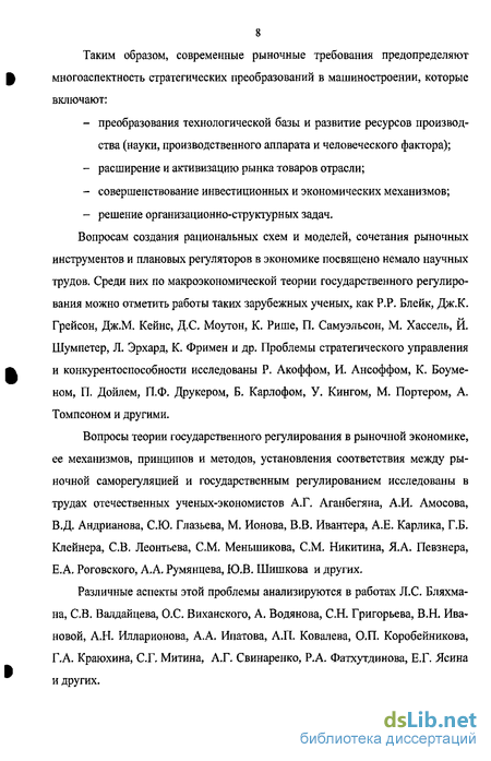Вопросам создания рациональных схем и моделей, сочетания рыночных инструментов и плановых регуляторов в экономике посвящено немало научных трудов. Среди них по макроэкономической теории государственного регулирования можно отметить работы таких зарубежных ученых, как P.P. Блейк, Дж.К. Грейсон, Дж.М. Кейнс, Д.С. Моутон, К. Рише, П. Самуэльсон, М. Хассель, Й. Шумпетер, Л. Эрхард, К. Фримен и др. Проблемы стратегического управления и конкурентоспособности исследованы Р. Акоффом, И. Ансоффом, К. Боуме-ном, П. Дойлем, П.Ф. Друкером, Б. Карлофом, У. Кингом, М. Портером, А. Томпсоном и другими.