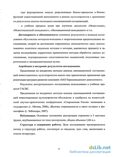 Методы исследования: Исследование методов анализа инновационной составляющей инвестиционных мультипроектов осуществлялось с применением структурно-функционального анализа, экономического анализа и экономико-математического моделирования, включая: общенаучные методы (системный анализ, комплексный анализ, дифференциацию и интеграцию (индукцию и дедукцию), программно-целевое планирование); статистические методы; методы детерминированного и стохастического факторного анализа; методы опти мизации систем (линейного и динамического программирования, теории игр, теории исследования операций) и др.