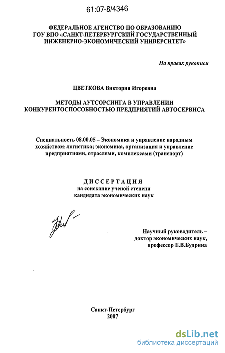 Целью диссертационного исследования является разработка методических рекомендаций и алгоритма эффективного управления на предприятиях автосервиса, способствующих значительному повышению конкурентоспособности таких предприятий, на основе использования методов аутсорсинга.