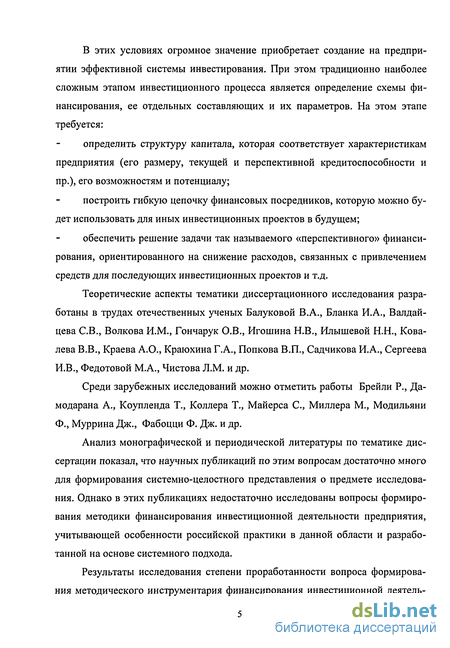 Анализ монографической и периодической литературы по тематике диссертации показал, что научных публикаций по этим вопросам достаточно много для формирования системно-целостного представления о предмете исследования. Однако в этих публикациях недостаточно исследованы вопросы формирования методики финансирования инвестиционной деятельности предприятия, учитывающей особенности российской практики в данной области и разработанной на основе системного подхода.