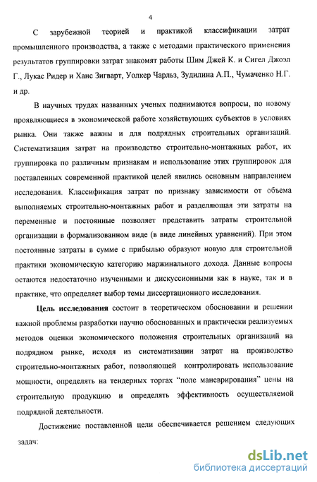 В научных трудах названных ученых поднимаются вопросы, по новому проявляющиеся в экономической работе хозяйствующих субъектов в условиях рынка. Они также важны и для подрядных строительных организаций. Систематизация затрат на производство строительно-монтажных работ, их группировка по различным признакам и использование этих группировок для поставленных современной практикой целей явились основным направлением исследования. Классификация затрат по признаку зависимости от объема выполняемых строительно-монтажных работ и разделяющая эти затраты на переменные и постоянные позволяет представить затраты строительной организации в формализованном виде (в виде линейных уравнений). При этом постоянные затраты в сумме с прибылью образуют новую для строительной практики экономическую категорию маржинального дохода. Данные вопросы остаются недостаточно изученными и дискуссионными как в науке, так и в практике, что определяет выбор темы диссертационного исследования.