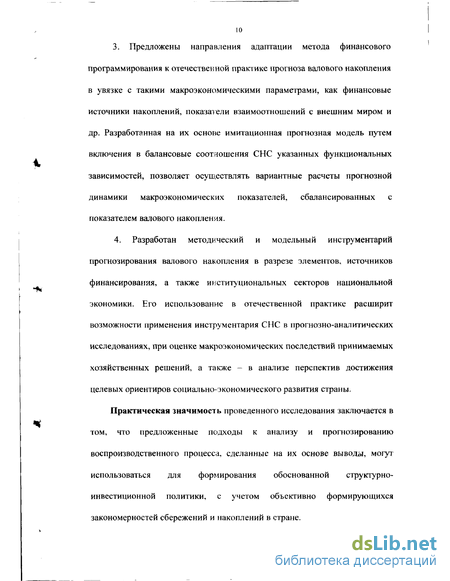 Важное значение здесь приобретает критическое переосмысление мирового опыта прогнозирования макроэкономических процессов, исследование возможностей его адаптации к особенностям российской экономики переходного периода и отечественной практике прогнозирования валового накопления в увязке с ключевыми параметрами развития национального хозяйства. Актуальным представляется использование выработанных мировой практикой современных методических инструментов прогноза, в частности, метода финансового программирования, нацеленного на разработку макроэкономических прогнозов в условиях ограниченной информации с привлечением функциональных взаимосвязей между ключевыми показателями развития экономики, отражаемыми системой национальных счетов, в платежном балансе и в других.