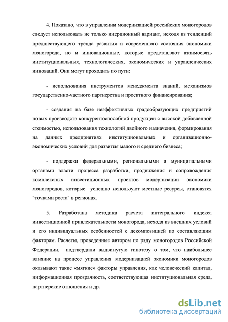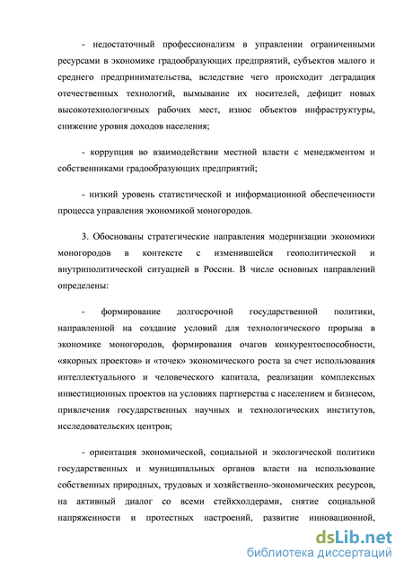 Свердловской области, Юрга в Кемеровской области, Канаш в Чувашии, Чегдомын в Хабаровском крае. На реализацию проектов модернизации экономики отмеченных моногородов в федеральном бюджете зарезервировано 3 млрд. рублей. Данные средства предназначены в первую очередь на финансирование инфраструктуры, необходимой для модернизации действующих и открытия новых предприятий, для снятия ограничений по транспорту, по энергетике, по водо- и газоснабжению. Часть ресурсов предполагается направить на субсидирование затрат предпринимателям, на переоборудование и создание новых рабочих мест, решение жилищных вопросов при переезде жителей моногородов к новым местам работы. 22 По мнению автора, от срока реализации пилотных проектов в указанных моногородах, анализа его результатов и продвижения лучших практик, до практического претворения отработанных управленческих технологий в других моногородах пройдет достаточно большой интервал времени, в течении которого могут существенно измениться условия и направления развития экономики моногородов. За этот период некоторые моногорода могут разделить участь американского моногорода Детройда. Кроме того, направления модернизации моногородов вновь сводятся к новым миллиардам из федерального бюджета. Автор считает более продуктивной институционально подкрепленную политику самостоятельного развития экономики монотерриторий, когда федеральная власть формирует долгосрочные условия функционирования их экономики, обеспечивает информационное и коммуникационное сопровождение процесса модернизации экономики.
