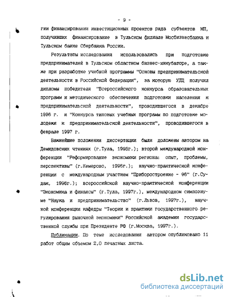 Важнейшие положения диссертации были доложены автором на Демидовских чтениях (г.Тула, 1995г.); второй международной конференции "Реформирование экономики региона: опыт, проблемы, перспективы" (г.Кемерово, 1996г.); научно-практической конференции с международным участием "Приборостроение - 96й (г.Судак, 1996г.); всероссийской научно-практической конференции "Экономика и финансы" (г.Тула, 1997г.)* международном симпозиуме "Наука и предпринимательство" (г.Львов, 1997г.), научной конференции кафедры "Теории и практики государственного.регулирования рыночной экономики" Российской академии государственной службы при Президенте РФ (г.Москва, 1997г.).