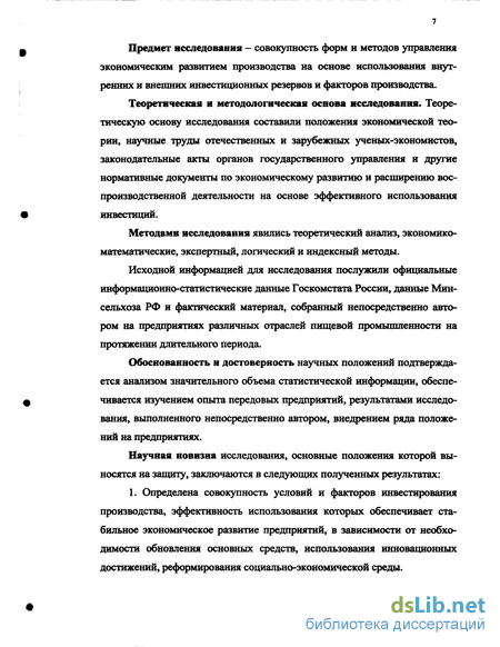 Предмет исследования - совокупность форм и методов управления экономическим развитием производства на основе использования внутренних и внешних инвестиционных резервов и факторов производства.