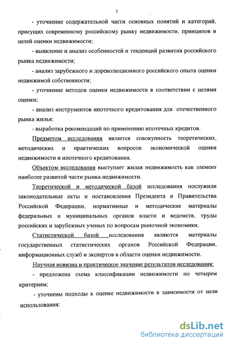 Целью диссертационной работы является разработка методических основ экономической оценки недвижимости в условиях России в соответствии с целями оценки и выбор ипотечных инструментов кредитования для активизации инвестиционной деятельности.