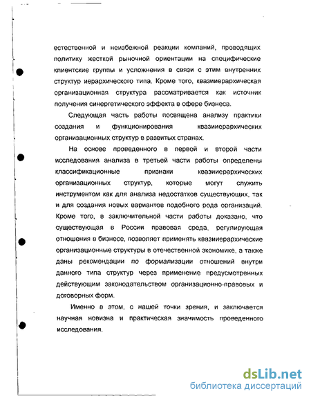 К сожалению в российской научной литературе до сих пор не было приведено результатов целостных исследований, определяющих принципы построения и функционирования квазииерархических организационных структур, без чего вряд ли возможно их эффективное применение, основанное на знании, а не на методе проб и ошибок {за которые в бизнесе приходится расплачиваться реальными деньгами).