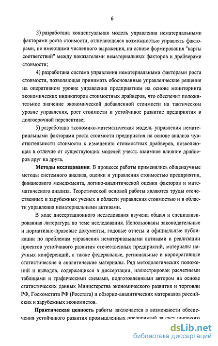 Методы исследования. В процессе работы применялись общенаучные методы системного анализа, оценки и управления стоимостью предприятия, финансового менеджмента, логико-аналитической оценки факторов и математического анализа. Теоретической основой работы являются труды отечественных и зарубежных ученых в области управления стоимостью и в области управления нематериальными активами.
