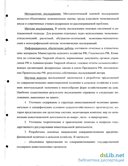 Научная новизна исследований заключается в разработке предложений по совершенствованию инвестиционной политики в сельском хозяйстве в усло виях многоукладной экономики и многообразия форм хозяйствования на селе. Наиболее существенные результаты исследования отражены в следующих положениях, выносимых на защиту: