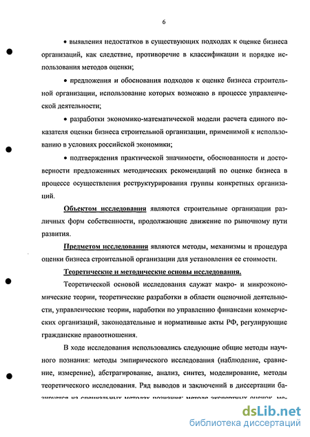 Предметом исследования являются методы, механизмы и процедура оценки бизнеса строительной организации для установления ее стоимости.