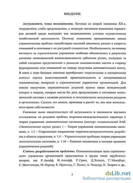 Актуальность темы исследования. Начиная со второй половины XX в. непрерывное, слабо предсказуемое, а зачастую внезапное изменение параметров деловой среды выступает как непреодолимое условие осуществления хозяйственной деятельности. Поэтому появлению принципиально новых управленческих проблем способствуют высокий динамизм, размах и скорость изменений в сочетании с их растущей сложностью. Необходимость по-новому взглянуть на стратегическое управление особенно обозначилась в результате усиления экономической взаимозависимости субъектов рынка, влекущих за собой смещение представлений о развитии экономических систем в сторону формирования сети отношений по поводу получения дополнительных выгод. В связи с этим большое значение приобретают теоретические и методические аспекты оценки инвестиционной привлекательности и согласованности экономических интересов в стратегическом управлении организацией. Для поиска наилучших управленческих решений нужны такие методический аппарат и модели, которые могли бы дать представление о состоянии экономической системы с позиции реальных и потенциальных вкладчиков ресурсов в организацию. Сделать это можно, принимая в расчёт то, как ими используются права собственности.