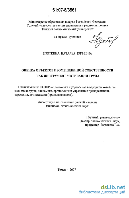 Предметом исследования является формирование объективной стоимости объектов промышленной собственности и мотивации труда работников научно-технической сферы на основе владения ими.
