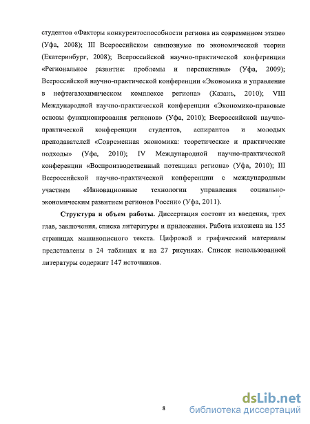 17 опубликованных научных трудах автора общим объемом 3,74 п.л., в том числе в 5 изданиях, рекомендованных ВАК РФ. Методические рекомендации по управлению социально-экономическим развитием региона в условиях риска обсуждены и одобрены на научно-практических конференциях: Республиканской научно-практической конференции молодых ученых и студентов «Факторы конкурентоспособности региона на современном этапе» (Уфа, 2008); III Всероссийском симпозиуме по экономической теории (Екатеринбург, 2008); Всероссийской научно-практической конференции «Региональное развитие: проблемы и перспективы» (Уфа, 2009); Всероссийской научно-практической конференции «Экономика и управление в нефтегазохимическом комплексе региона» (Казань, 2010); VIII Международной научно-практической конференции «Экономико-правовые основы функционирования регионов» (Уфа, 2010); Всероссийской научно-практической конференции студентов, аспирантов и молодых преподавателей «Современная экономика: теоретические и практические подходы» (Уфа, 2010); IV Международной научно-практической конференции «Воспроизводственный потенциал региона» (Уфа, 2010); III Всероссийской научно-практической конференции с международным участием «Инновационные технологии управления социально-экономическим развитием регионов России» (Уфа, 2011).