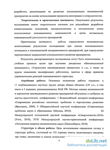 Апробация работы. Основные положения работы отражены в 11 опубликованных научных трудах автора общим объемом 4,45 п.л., в том числе в 3 изданиях, рекомендованных ВАК РФ. Методы оценки возможностей и перспектив инновационного развития предприятий обсуждены и одобрены на научно-практических конференциях: I Всероссийской интернет-конференции «Современная российская экономика: проблемы и перспективы развития» (Ярославль, 2009), V Общероссийской научной конференции «Современные проблемы науки и образования» (Москва, 2010), XI Международной молодежной научной конференции «Севергеоэкотех-2010» (Ухта, 2010),