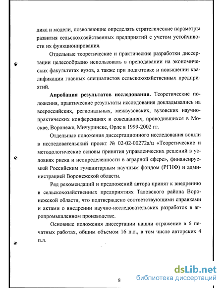 Отдельные положения диссертационного исследования вошли в исследовательский проект № 02-02-00272а/ц «Теоретические и методологические основы принятия управленческих решений в условиях риска и неопределенности в аграрной сфере», финансируемый Российским гуманитарным научным фондом (РГНФ) и администрацией Воронежской области.