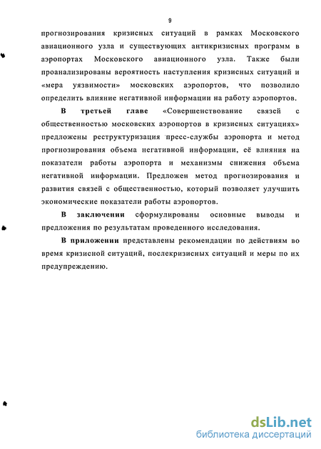 - предложен механизм по комплексному совершенствованию антикризисной системы аэропортов Московского авиационного узла, который позволяет более эффективно организовать связи с общественностью в кризисных ситуациях.