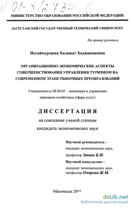 Теоретическую и методологическую основу диссертации составили научные разработки отечественных и зарубежных ученых по проблемам развития и управления туризмом, законодательные и нормативные акты РФ и РД в области туризма, а также методы экономического и логического анализа и системного подхода.