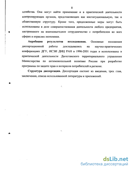 Апробация результатов исследования. Основные положения диссертационной работы докладывались на научно-практических конференциях ДГУ, ИСЭИ ДНИ, РАН в 1996-2001 годах и использованы в практической деятельности Дагестанского территориального управления Министерства по антимонопольной политике России при разработке программы по защите прав и интересов потребителей в регионе.