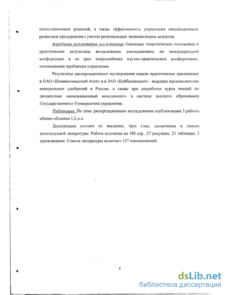 Результаты диссертационного исследования нашли практическое применение в ОАО «Невинномысский Азот» и в ЗАО «Куйбышевазот» - ведущих производителях минеральных удобрений в России, а также при разработке курса лекций по дисциплине «инновационный менеджмент» в системе высшего образования Государственного Университета управления.