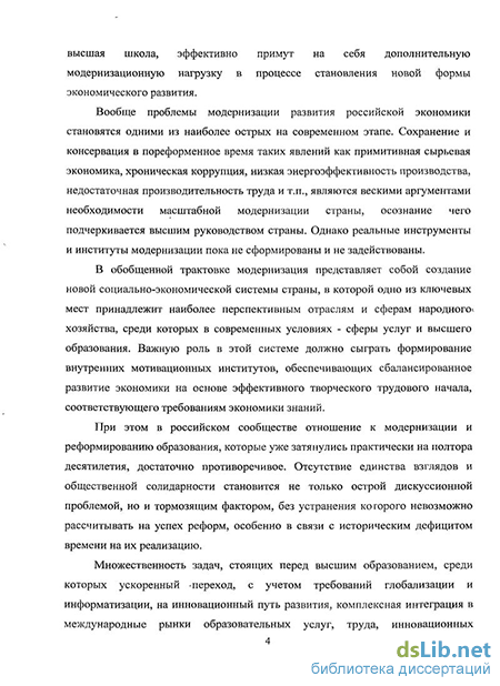 В обобщенной трактовке модернизация представляет собой создание новой социально-экономической системы страны, в которой одно из ключевых мест принадлежит наиболее перспективным отраслям и сферам народного хозяйства, среди которых в современных условиях - сферы услуг и высшего образования. Важную роль в этой системе должно сыграть формирование внутренних мотивационных институтов, обеспечивающих сбалансированное развитие экономики на основе эффективного творческого трудового начала, соответствующего требованиям экономики знаний.
