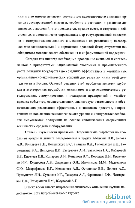 Степень изученности проблемы. Теоретические разработки по проблемам аренды и лизинга сосредоточены в трудах Абалкина Л.И., Белова А.В., Васильева Г.И., Волынского B.C., Газмана В.Д., Голощапова В.В., Го-ремыкина В.А., Демидова Е.Е., Евстратова А.Н., Завьялова П.С., Кабатовой В.Е., Киселева И.Б., Комарова А.И., Комарова В.Ф., Королева В.Н., Кравченко И.К., Курносова А.В., Лаврушина О.И., Максимова М.М., Медведкова С.Ю., Митрофанова И.Г., Молчанова А.И., Остапенко В.В., Попова А.С., Прилуцкого Л.Н., Сусаняна К.Г., Токарева А.Л., Францевой Е.Ф., Чекмаре-вой Е.Н., Четыркиной Е.М., Юсуповой А.Т.