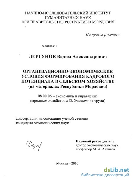 Предметом исследования являются организационно-экономические процессы формирования кадрового потенциала в сельском хозяйстве.