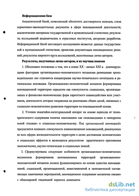 Представленные в диссертации теоретические, методологические, методические и практические разработки обладают завершенностью и обоснованностью, их использо вание позволяет определять стратегию направлений совершенствования организационно-экономического механизма формирования территорий инновационного развития.