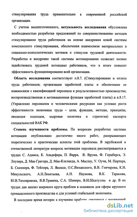 Степень изученности проблемы. По вопросам разработки системы мотивации опубликовано достаточно много работ, раскрывающих теоретические и практические аспекты этой проблемы. В зарубежной и отечественной литературе вопросы мотивации персонала рассматриваются в трудах С. Адамса, К. Альдефера, П. Варра, В. Врума, Ф. Герцберга, Э. Лоулера, Д. Мак-Грегора, Д. Мак-Клеланда, А. Маслоу, У. Оучи, М. Портера, Б. Скиннера, Ф. Тейлора, Л. Якокки, О.С.Виханского, В.В. Гончарова, К.Н. Микульского, А.Н.Леонтьева, А.Н. Наумова, В.К. Тарасова, Ю.В.Тихонравова, В.В.Травина, С.А. Шапиро, В.И.Шкатуллы и др. В их трудах дан анализ широкого круга проблем в основном для сферы крупного промышленного производства и для условий стабильной экономики.