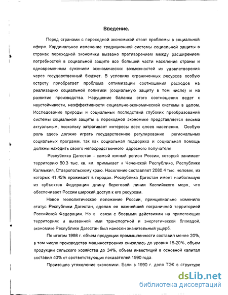 Выбор темы диссертационного исследования был обусловлен необходимостью проанализировать сложившуюся ситуацию в экономике России в целом и Республике Дагестан в частности, и стремлением предложить ряд мер направленных на совершенствование государственного регулирования исполнения социальных программ и повышения благосостояния народа проживающего в республике Дагестан.