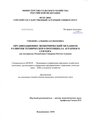 Апробация результатов исследования. Основные положения диссертации обсуждались в Министерстве сельского хозяйства и продовольствия РСО-Алания, доложены на TV и V Международных научно-практических конференциях в Пензе (2007г.), на научно-практических конференциях Горского Государственного Аграрного Университета (2008г.). Результаты исследования рекомендованы для использования при разработке Программы создания машинно-технологических станций в РСО-Алания. По теме диссертации опубликованы 7 печатных работ.