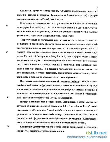 Объект и предмет исследования. Объектом исследования являются сельские лесхозы и аграрные формирования (лесопользователи) агропромышленного комплекса Республики Адыгея.