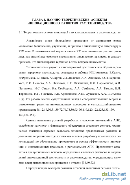 Экономическая сущность инновационной деятельности и её роль в развитии аграрного производства освещены в работах И.Шумпетера, Б.Санто, Д.Фридмана, Б.Твисса, А.Саргоп, Л.С.Водачек, А.А. Апишева, Ю.И. Бершиц-кого, В.И. Нечаева, А.А. Никонова, Е.С. Оглоблина, П.Ф. Парамонова, А.В. Петрикова, И.С. Санду, В.а. Свободина, А.А. Семёнова, А.А. Тамова, Е.Л. Торопцева, И.Г. Ушачёва, Ф.П. Хрипливого, А.Ш. Хуажевой. А.А. Шутькова и др. Их работы внесли существенный вклад в совершенствование теории и методологии развития инновационных процессов в сельскохозяйственном производстве