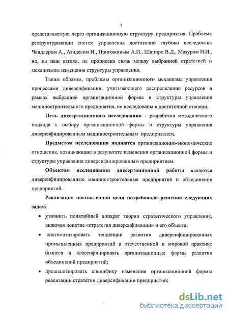 Цель диссертационного исследования - разработка методического подхода к выбору организационной формы и структуры управления диверсифицированным машиностроительным предприятием.