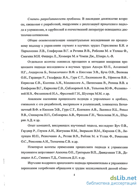 Изучение внедрения процессного подхода применительно к управлению персоналом потребовало обращения к трудам исследователей данной облас- ти, таким как Анисимов В.М., Апенько С.Н., Армстронг М., Артамонова Н.В., Грехем Х.Т., Дуракова И.Б., Дятлов В.А., Захаров Д.К., Кибанов А.Я., Магура М.И., Маслов Е.В., Миляева Л.Г., Одегов Ю.Г., Озерникова Т.Г., По- ловинко B.C., Руденко Г.Г., Травин В.В. и др.