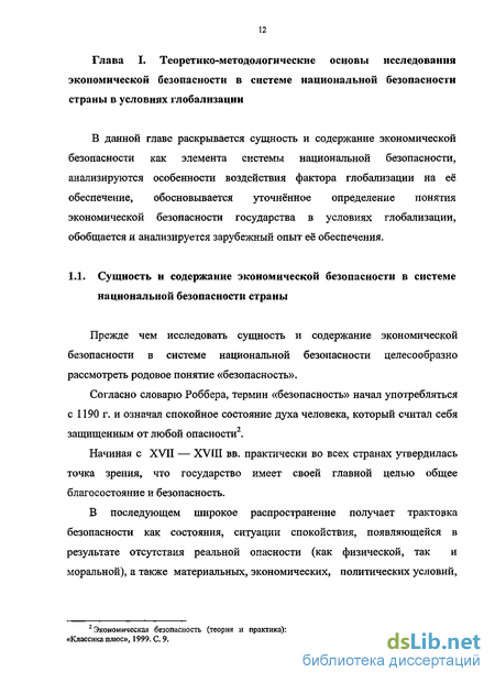 диссертационных исследований, научных статей и публикаций в периодической печати по данной проблематике. Однако изучение научных работ, в которых затронуты проблемы экономической безопасности, не позволяет сделать вывод о комплексном подходе к исследованию вопросов совершенствования механизма обеспечения экономической безопасности в системе национальной безопасности Российской Федерации в условиях глобализации.