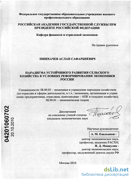 І. Актуальность темы диссертационного исследования обусловлена необходимостью дальнейшей конкретизации и обновления направлений реформирования аграрной экономики страны в контексте установок базового федерального закона «О развитии сельского хозяйства» (от 29 декабря 2006 г. № 264-ФЗ), Государственной программы развития сельского хозяйства и рынка сельскохозяйственной продукции, сырья и продовольствия на 2008-2012 гг., а также Доктрины продовольственной безопасности Российской Федерации.