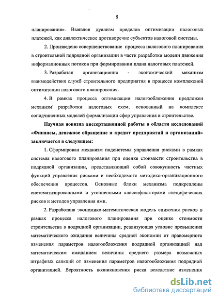 Разработана экономико-математическая модель снижения рисков в рамках процесса налогового планирования при оценке стоимости строительства в подрядной организации, реализующая условие превышения математического ожидания величины средней экономии от правомерного изменения параметров налогообложения подрядной организацией над математическим ожиданием величины среднего размера возможных штрафных санкций от изменения параметров налогообложения подрядной организацией. Вероятность возникновения риска вследствие изменения
